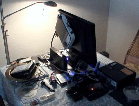 (Provisorium: Zwei HDDs intern angeschlossen; interner SATA-DVD-Brenner über Adapter von außen über USB aktiviert.)
