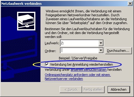 Ist dieser Haken gesetzt (muß nur einmalig bei der Einbindung von NW-Laufwerken gemacht werden):
