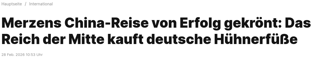 Optionen Kanzler Merz's Chinareise von Erfolg gekrönt.... hjb am 03.03.2026, 14:39 / 0 Antworten / Baumansicht Nickles Die deutsche Wirtschaft ist gerettet! Antwort absenden bei Antwort benachrichtigen