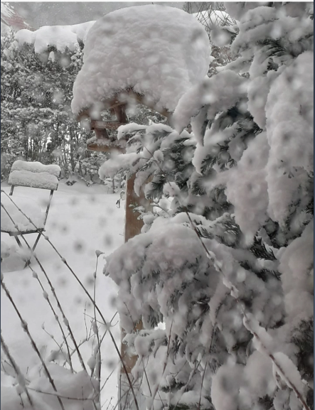 Blick aus meinem Wohnzimmerfenster in den Vorgarten (sind ein paar Tropfen von den getauten Schneeflocken an der Scheibe, daher nicht so ganz scharf - aber die Haube auf dem Futterhaus kann man ganz gut erkennen). Seit gestern früh sind es ca. 23 cm, die hier heruntergekommen sind. Und - wie schon in der Überschrift bemerkt: es schneit und schneit und schneit.....