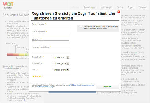 Die Verpflichtung, dich zu Registrieren ist ja nur gegeben, wenn du auch wirklich alle Möglichkeiten der Communityteilnahme bei WOT nutzen willst - wenn es dir nur um generelle Aussagen á la "Seite ist okay", "wollen zu viele Dinge wissen", "schlechter Service", etc. geht, dann lass dass mit der Dateneingabe.