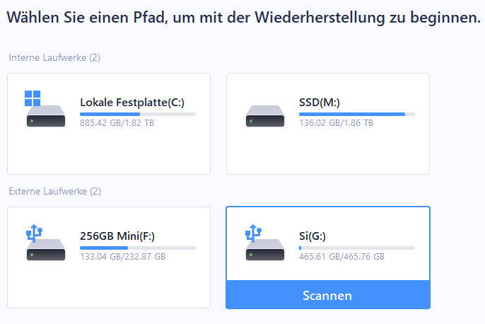 Dann habe ich eine externe Festplatte in 3 Partitionen angeschlossen (E,F und G)