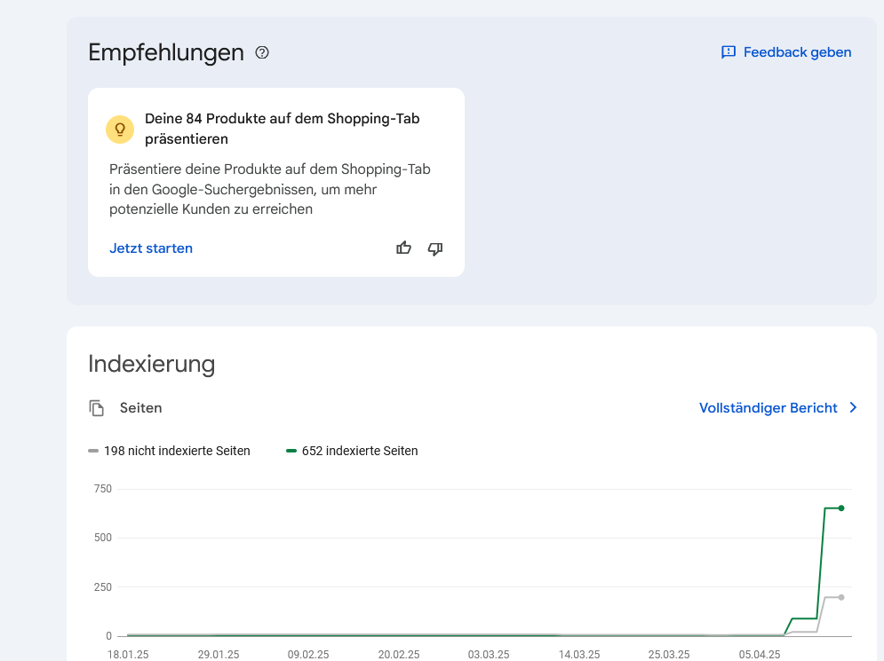 so sieht das aus wenn ich mir eine meiner wordpress seiten in google ansehen, dann habe ich angeblich 84 produkte auf dem shopping app und 652 indexierte seiten.