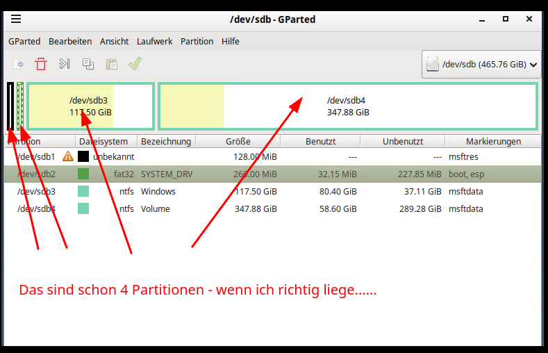 Ich habe mal einen Screenshot aus einer VM gemacht, da werden die Partitionen zwar nach dem Linux-System angezeigt, aber du solltest damit klar kommen - ( /dev/sdb4 wäre unter Windows dann die Partiton "F" - und mehr geht halt nicht als "primär"): Nach meinem Verständnis legt Win also schon mindestens 4 Partitionen an. Wie geschrieben: Ich weiß nicht, ob die ersten 2 Partitionen da schon irgendwie "mitzählen", wenn ja, dann müsstest du eventuell erst eine erweiterte Partition erstellen, weil du ja insgesamt dann mehr als 4 Partitionen hast usw....