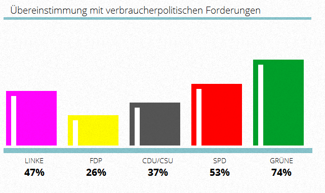 Wichtig zu wissen ist, dass für die Auswertung nur die aktuell im Bundestag vertretenen Parteien berücksichtigt werden. Der Verbraucherzentrale Bundesverband hat die veröffentlichten Wahlprogramme dieser Parteien für seine Wahlhilfe herangezogen.