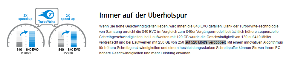 Laut Untersuchung von Techreport kann die Leseleistung im Extremfall auf rund 35 MByte/s einbrechen, also auf das Tempo eher vergreister mechanischer Festplattentechnologie. Im Normalfall schafft eine 840 EVO bis zu 410 MByte/s (120 GByte Modell) oder gar 520 MByte/s (250 GByte Modell).