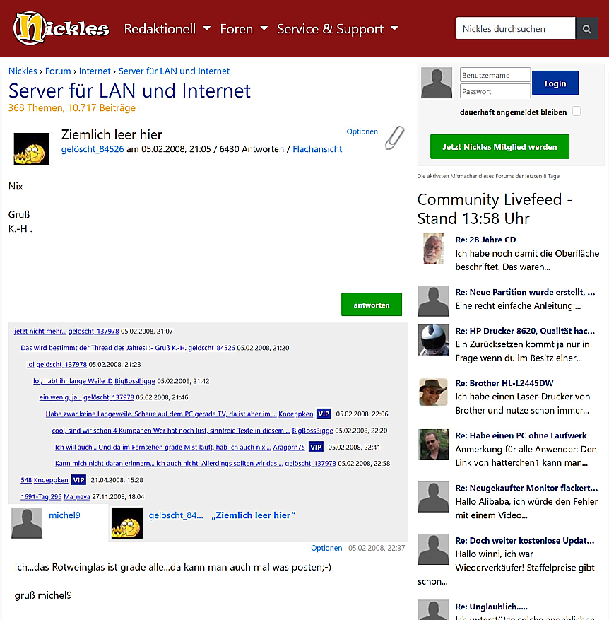 Gestern habe ich den alten Thread von Heinz nur für den Bruchteil einer Sekunde gesehen, dann wurde auf die Nickles-Startseite umgeleitet.