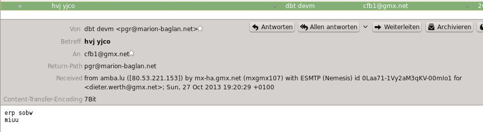 from amba.lu ([80.53.221.153]) by mx-ha.gmx.net (mxgmx107) with ESMTP (Nemesis) id 0Laa71-1Vy2aM3qKV-00mIo1 for <dieter.werth@gmx.net>; Sun, 27 Oct 2013 19:20:29 +0100