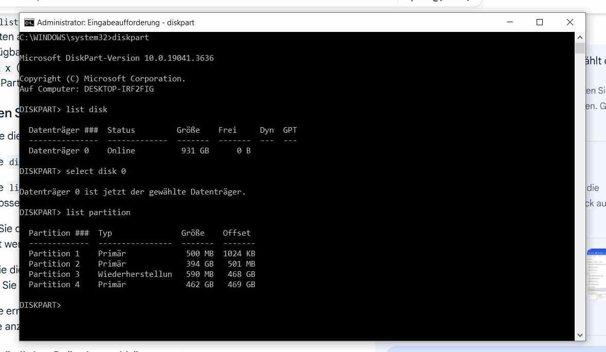 capmira Eludi84 „Als Administrator: - Diskpart - list disk - select disk Nummer - list partition So gemacht?“