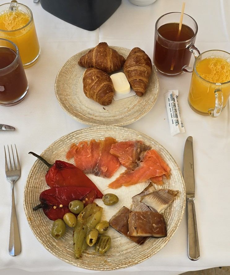 Ich liebe mein mediterranes Frühstück, ich möchte ja nicht klein und dick werden.Lächelnd