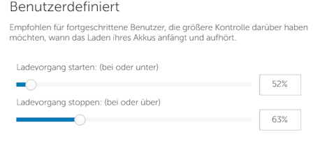 Die Werte reichen von 80 bis 100% und sind in 5%-Schritte unterteilt. Ich habe 90% gewählt, weil mir der Akku bei 80 einerseits ein wenig zu früh in die Knie geht, ich den Akku andererseits aber auch ein bisschen schonen will.